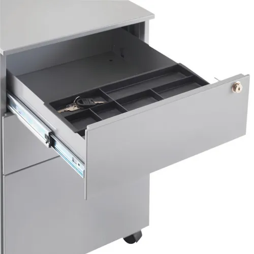 This entry level First mobile steel pedestal features 2 stationery drawers and 1 filing drawer suitable for use with A4 suspension files. The tough steel carcass features an anti-tilt mechanism, allowing only 1 drawer open at a time. This pedestal measures W380 x D470 x H615mm and comes in a silver finish with an integrated handle design.