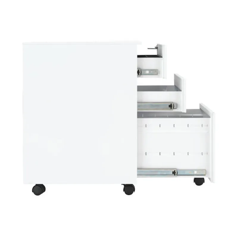 This entry level First mobile steel pedestal features 2 stationery drawers and 1 filing drawer suitable for use with A4 suspension files. The tough steel carcass features an anti-tilt mechanism, allowing only 1 drawer open at a time. This pedestal measures W380 x D470 x H615mm and comes in white with an integrated handle design.