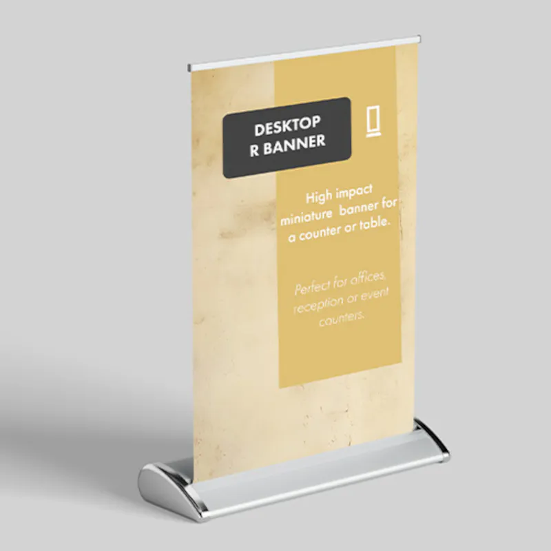 Desktop Roller Banner available in A4 & A3 sizes.Front roller mechanism to protect graphic for shipping purposes.MOQ 10 units.Recommended graphic thickness: 200 micron.Perfect for offices, reception or event counters.