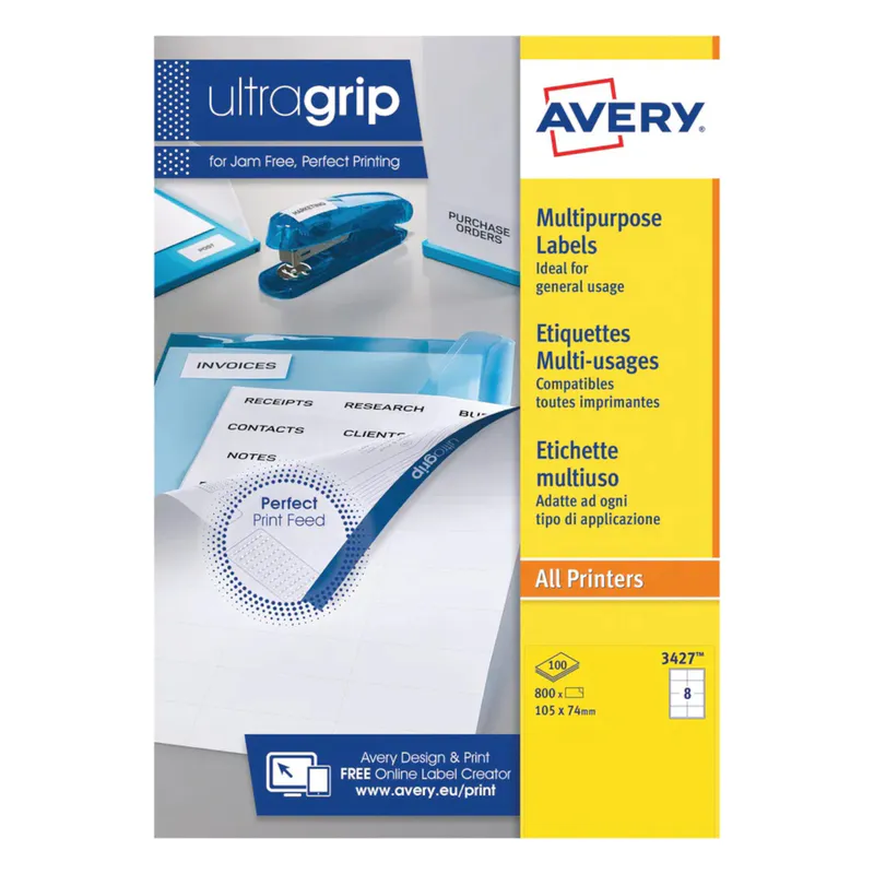 These handy Avery Ultragrip multipurpose labels are for use in most laser and inkjet printers, including multifunctional devices and photocopiers. Designed to be jam free, the labels provide reliable results with sharp prints and excellent adhesion. Ideal for a variety of labelling applications, these white labels measure 105 x 74mm. This pack contains 100 A4 sheets with 8 labels per sheet (800 labels in total).Branded Avery labels with UltraGrip technologyMultipurpose: laser, inkjet, copierJam free for easy printing100 sheets, 8 labels per sheetLabel size: 105 x 74mmColour: WhitePack