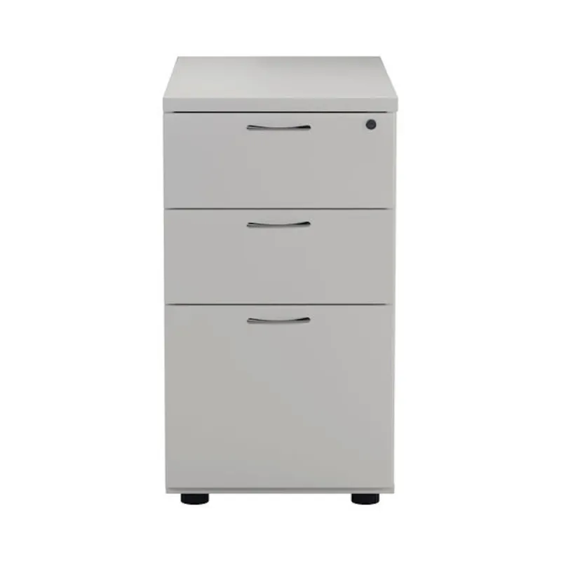 Offering a convenient and flexible place to store documents, papers and stationery, this white-finish, desk high pedestal can fit conveniently next to your desk to provide additional work space. The pedestal features 2 box drawers and 1 filing drawer suitable for foolscap suspension filing. This pedestal measures W404 x D800 x H730mm and can be placed beside the 800mm end of a radial desk, or used with a standard desk.
