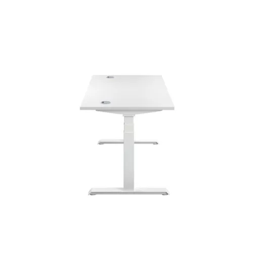 This Sit/Stand Desk features 3 stage height adjustability with a digital display and 4 pre-set buttons for an easy transition between sitting and standing. The 25mm thick desktop is mounted on sturdy cantilever legs and features dual cable management ports. This desk measures 1400x800x630-1290mm and comes finished in white with white legs.